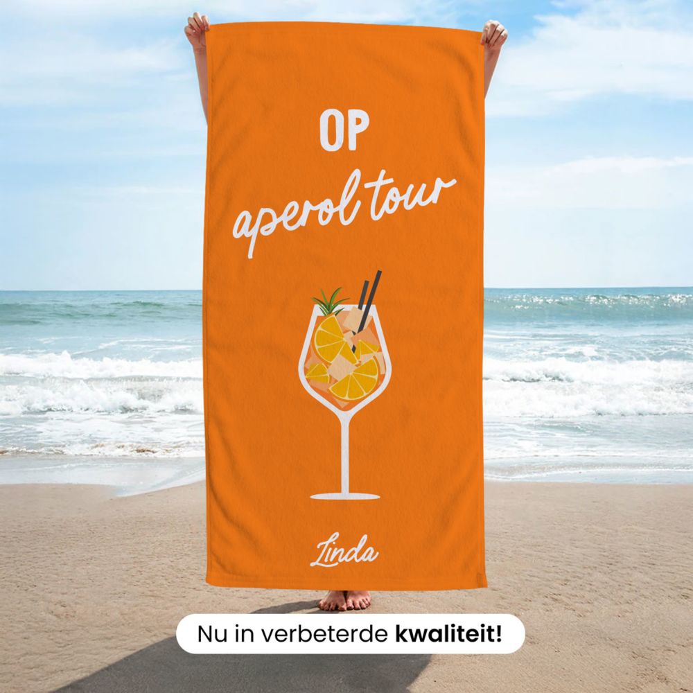 Een must-have voor jouw vakantie van onze geliefde serie “coole accessoires voor op het strand en bij het zwembad”. Namelijk onze gepersonaliseerde handdoek met drankjes en tekst, die je niet alleen met jouw eigen tekst kan personaliseren, maar ook met jouw favoriete drankje. Natuurlijk ook handig voor op het ligbedje of om je af te drogen (wat voor een handdoek natuurlijk niet atypisch is).